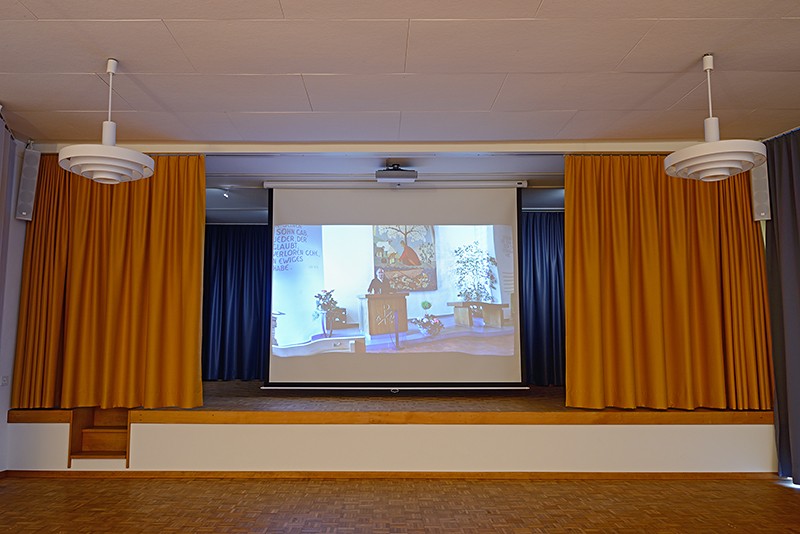 Im Kirchensaal ist eine kleine Bühne mit Leinwand und Prokischreiber vorhanden. Ebenfalls befindet sich in einem abgetrennten Raum eine gut eingerichtete Küche.